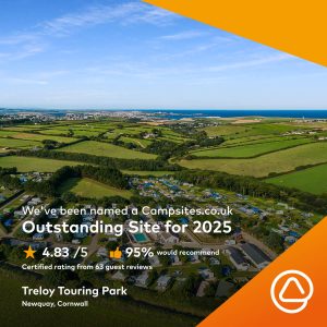 Treloy Touring Park is proud to have been recognised as one of Campsites.co.uk’s Outstanding Sites for 2025 – an award that celebrates the very best camping destinations across the UK.